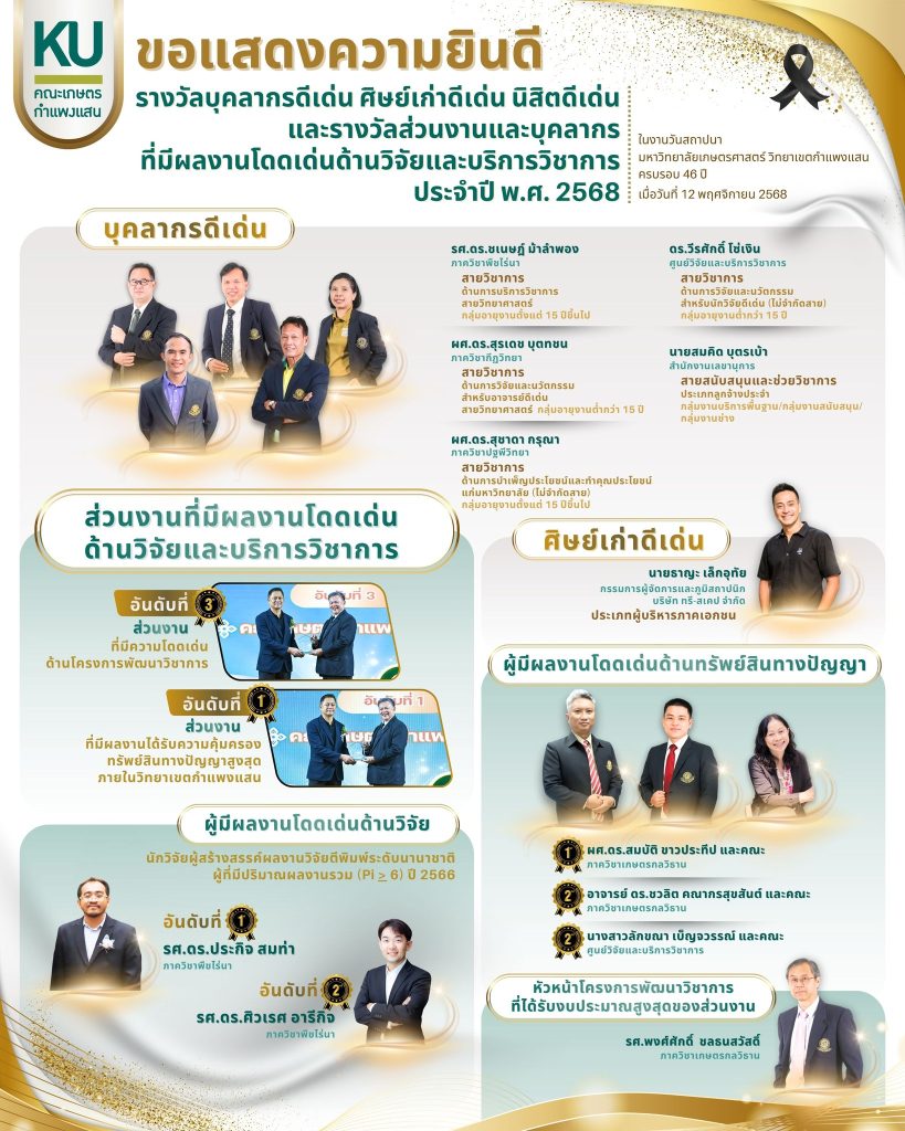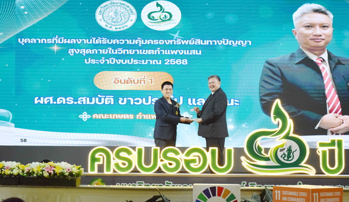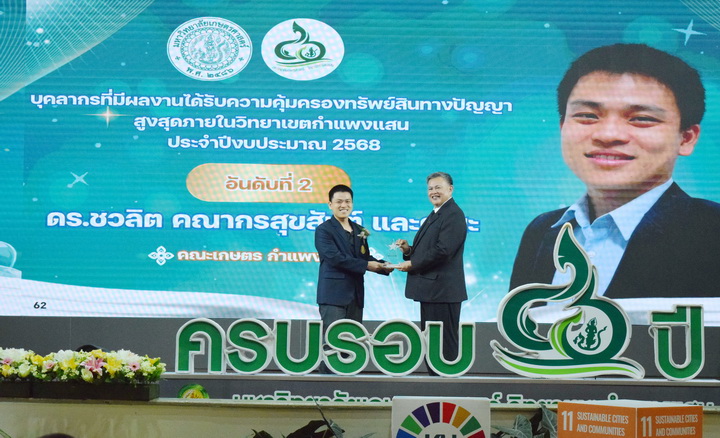 “บุคลากรดีเด่น ศิษย์เก่าดีเด่น นิสิตดีเด่น และรางวัลส่วนงานและบุคลากรที่มีผลงานโดดเด่นด้านวิจัยและบริการวิชาการ ประจำปี พ.ศ. 2568″ ในงานวันสถาปนามหาวิทยาลัยเกษตรศาสตร์ วิทยาเขตกำแพงแสน ครบรอบ 46 ปี ได้แก่ ” รางวัลผู้มีผลงานโดดเด่นด้านทรัพย์สินทางปัญญาสูงสุดในวิทยาเขตกำแพงแสน อันดับที่ 1 ผศ.ดร.สมบัติ ขาวประทีป และ อันดับที่ 2 ดร.ชวลิต คณากรสุขสันต์ ” และ “รางวัลหัวหน้าโครงการพัฒนาวิชาการที่ได้รับงบประมาณสูงสุดของส่วนงานภายใน คณะเกษตร กำแพงแสน ประจำปีงบประมาณ 2568 ได้แก่ รศ.พงศ์ศักดิ์ ชลธนสวัสดิ์ “